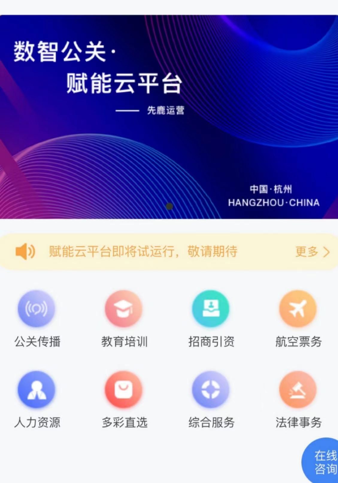省公关协会创建的“赋能云平台”现阶段设置公共传播、教育培训、招商引资、航空票务、人力资源、多彩直选、综合服务、法律事务等八个服务版块,下一步将组织试运行。